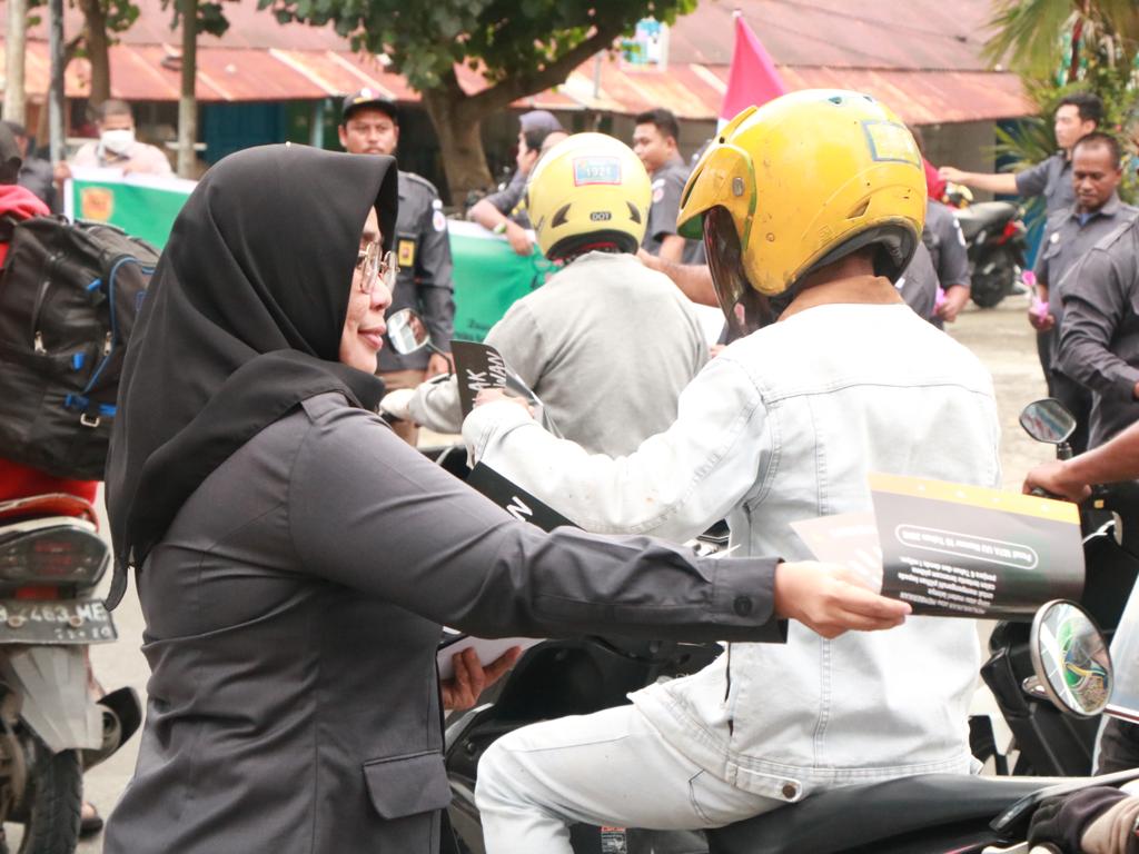 Anggota Bawaslu Papua Barat, Nurlaila Muhammad, Saat membagikan bunga dan Poster Anti Politik Uang Kepada Masyarakat Pengguna Jalan di Depan Kantor Bawaslu Papua Barat[/caption]