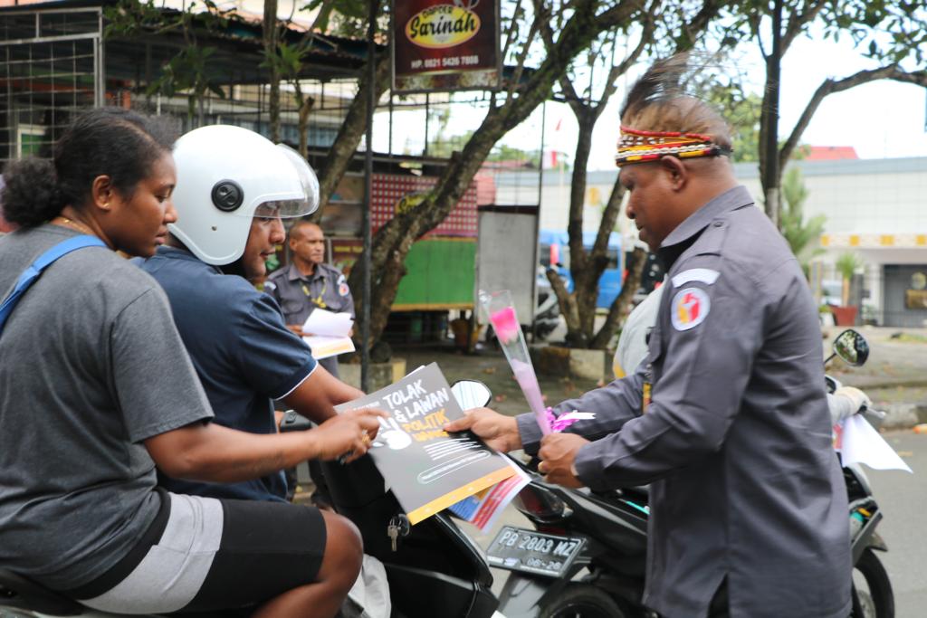 Anggota Bawaslu Papua Barat, Agustinus Simson Naa, Saat membagikan bunga dan Poster Anti Politik Uang Kepada Masyarakat Pengguna Jalan di Depan Kantor Bawaslu Papua Barat[/caption]