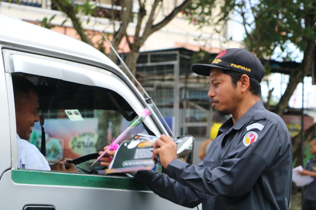 Anggota Bawaslu Papua Barat, Muh. Nazil Hilmie Saat Membagikan Bunga dan poster anti politik uang kepada Masyarakat Pengguna Jalan di Depan Kantor Bawaslu Papua Barat[/caption]