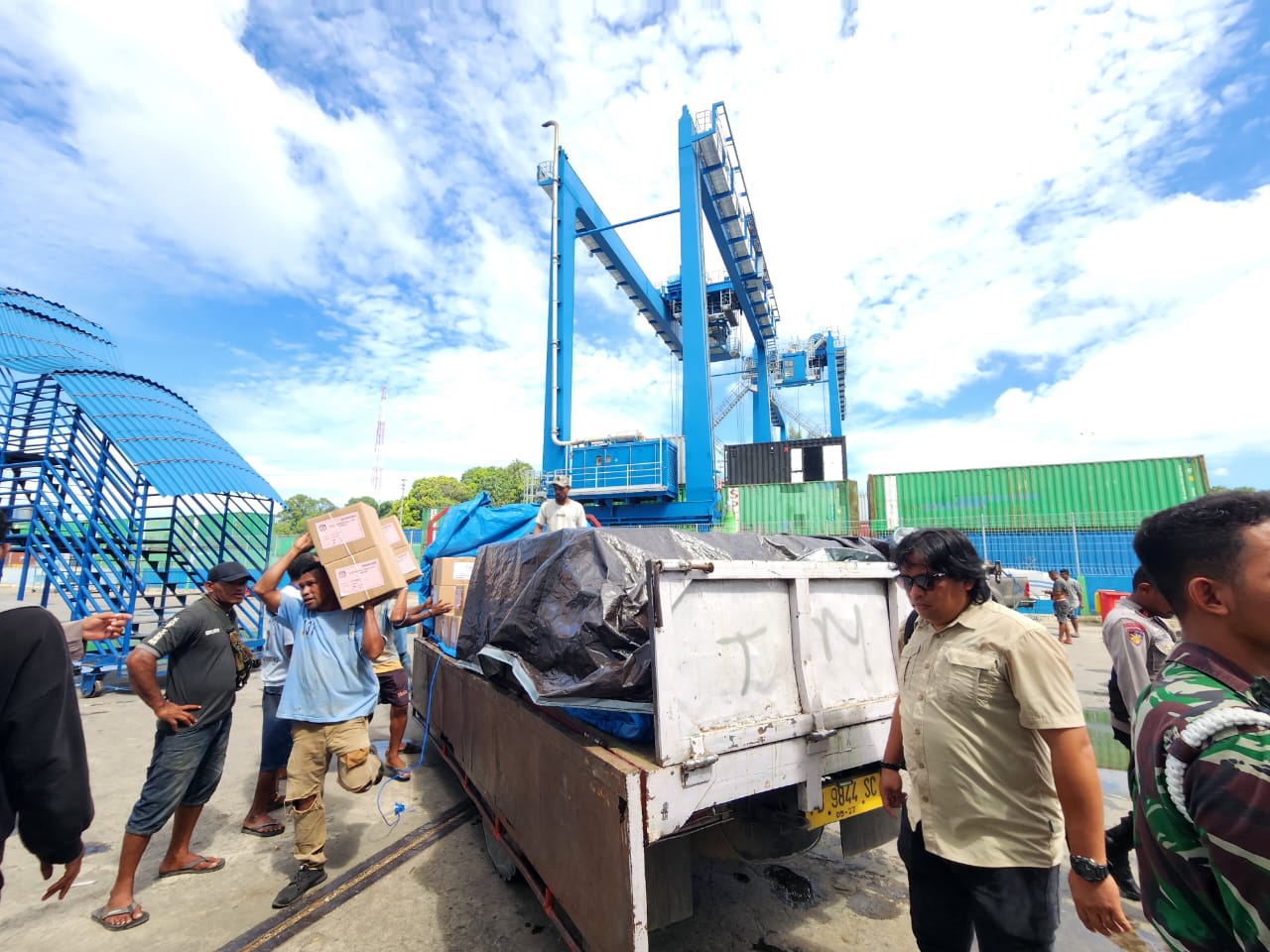 Kota Sorong, Bawaslu Papua Barat-Bawaslu Provinsi Papua Barat melakukan pengawasan secara langsung pembongkaran kontainer berisi surat suara Pemilu 2024 yang akan didistribusikan ke Kabupaten Kaimana dan Kabupaten Fakfak. Pembongkaran kontainer ini berlangsung di Pelabuhan Kontainer Kota Sorong dengan pengawalan ketat dari kepolisian setempat (Minggu, 31/12/2023).
