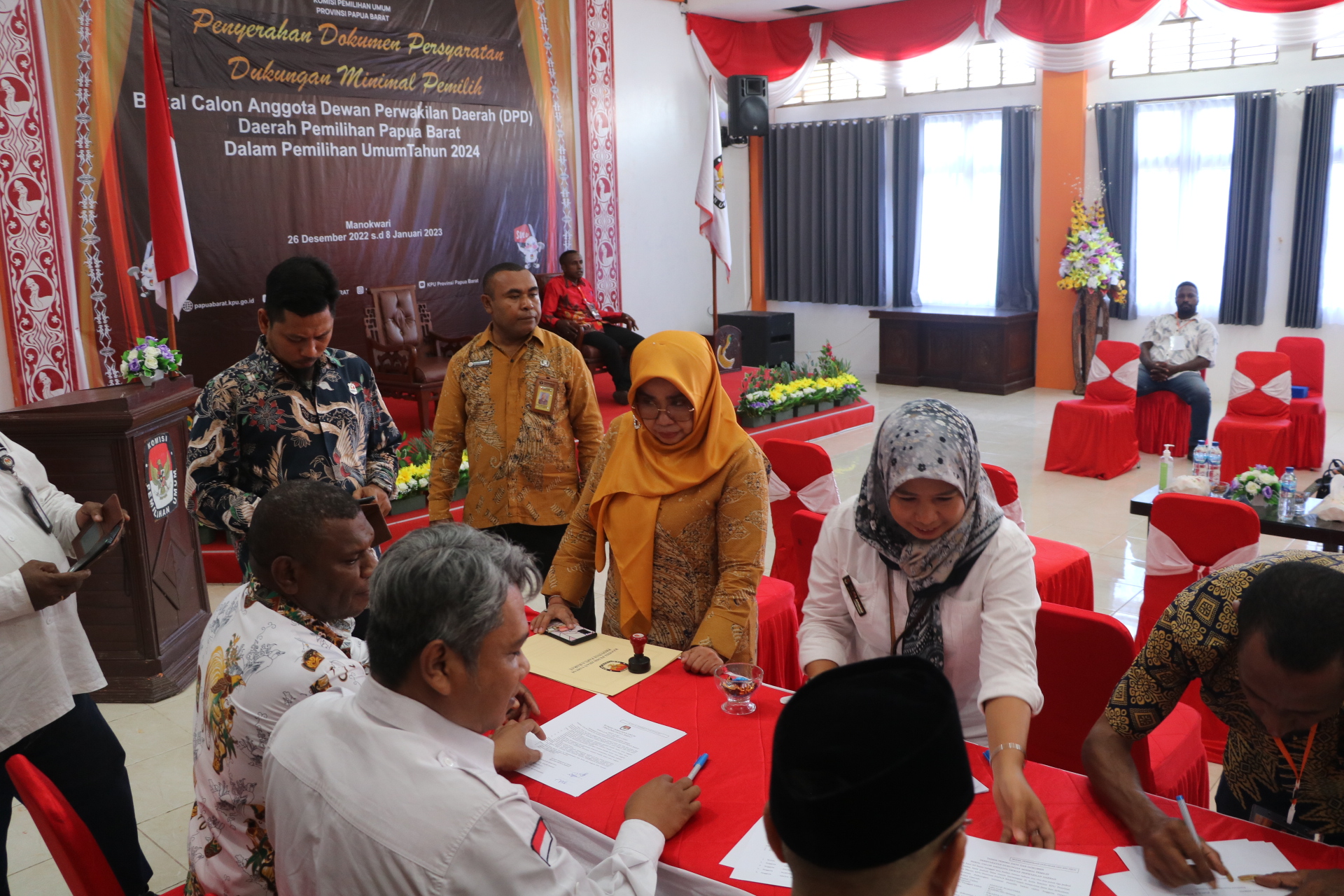 Sejak dibukanya masa penyerahan syarat minimal dukungan tanggal 26 Desember 2022 lalu, telah ada 4 bakal calon anggota DPD Provinsi Papua Barat yang telah menyerahkan dan dinyatakan diterima berkas dukungannya oleh KPU Provinsi Papua Barat.