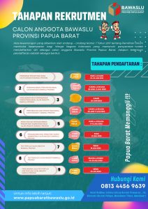 Dalam rangka pembentukan Bawaslu Provinsi Papua Barat, maka Tim Seleksi Calon Anggota Bawaslu Provinsi Papua Barat berdasarkan Keputusan Bawaslu Nomor: 1243.1/K.BAWASLU/HK.01.01/06/2022 atas kewenangan yang diberikan oleh Undang-Undang Nomor 7 Tahun 2017 tentang Pemilihan Umum membuka kesempatan bagi Warga Negara Indonesia yang memenuhi persyaratan untuk mendaftarkan diri sebagai calon anggota Bawaslu Provinsi Papua Barat.