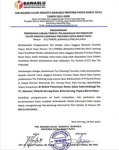 Seubungan dengan pelaksanaan Tes Psikologi Tersebut, maka disampaikan kepada seluruh Calon Anggota Bawaslu Provinsi Papua Barat Daya bahwa pelaksanaan Tes Psikologi yang semula akan dilaksanakan di M Kyriad Hotel, Jl. Sungai Maruni, Klawuyuk, Kec. Sorong Utara, Kota Sorong, dipindahkan lokasi/tempatnya di Rylich Panorama Hotel, Jalan Samratulangi No. 57, Klasuur, Distrik Sorong Kota, Kota Sorong, Papua Barat Daya.